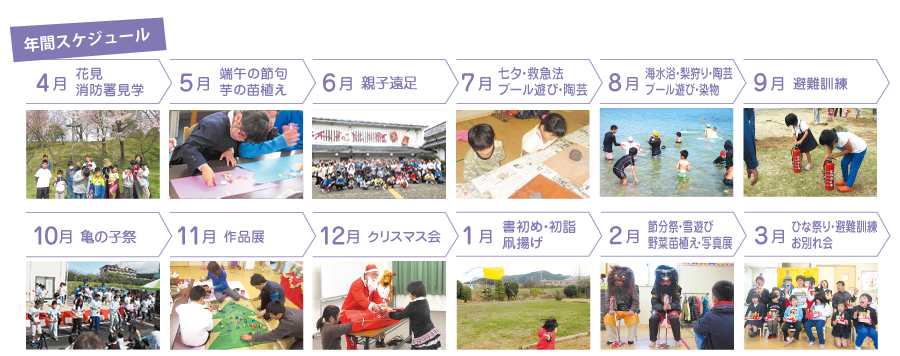 | 給食 | 全園児完全給食 3才児以上児は毎月米代を集金させて頂きます。 |