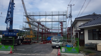 防災センターは、基礎工事後終わり鉄骨の組み立てが昨日から始まりました。