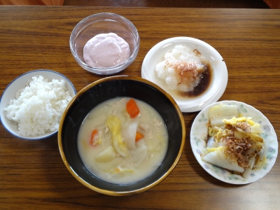 ごはん・白菜とカブのクリームシチュー・白菜のお浸し・大根おろし・イチゴフルーチェ