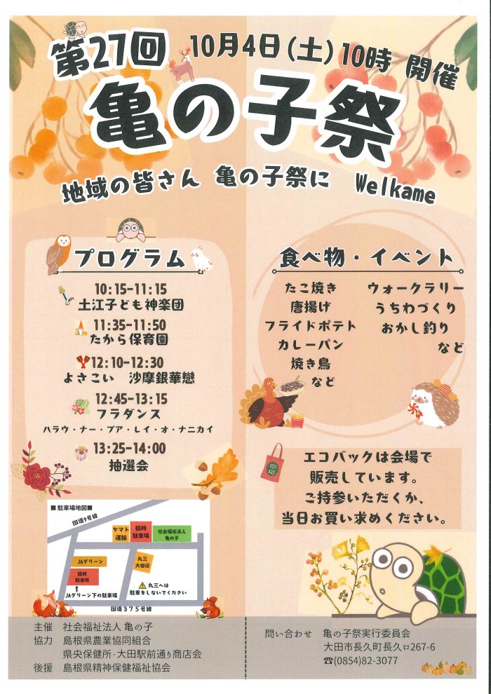「地域の皆さん 亀の子祭に Welkame(ウェルカメ)」をテーマに、第27回亀の子祭を、10月4日(土)に行います。