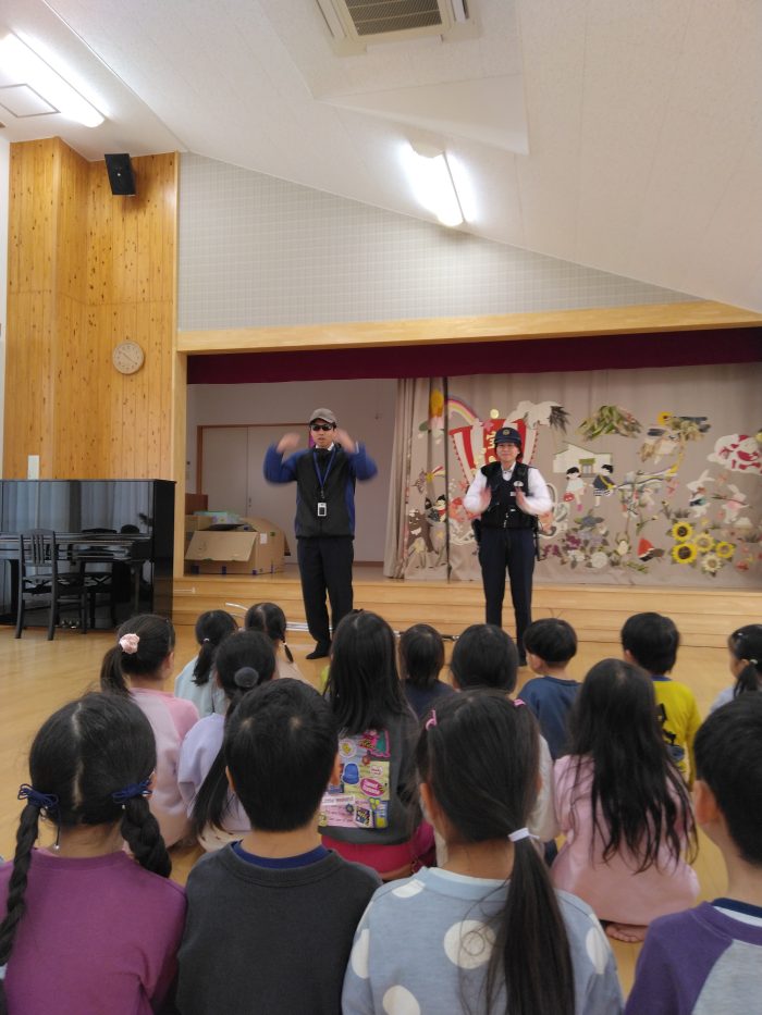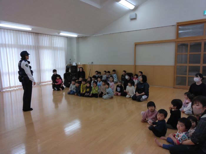 避難訓練後におまわりさんが、子ども達に「お菓子あげるからおいで✋」と言われたら、どうしたらいいのか?など…いろいろお話をしてくださいました。
