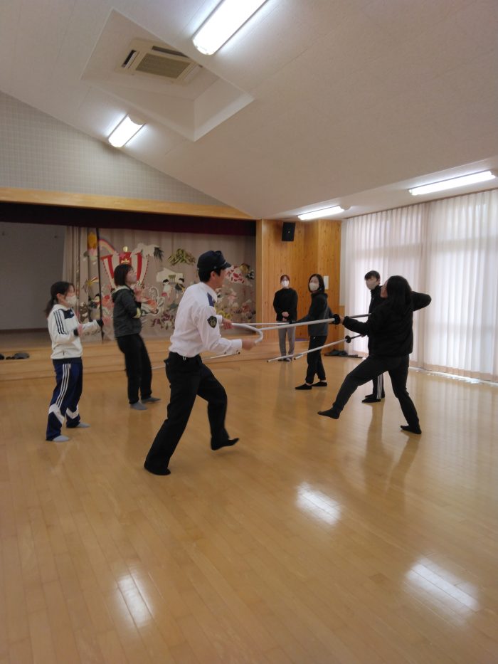 私たち職員も実際に刺股を手に持って、使い方を勉強しました。