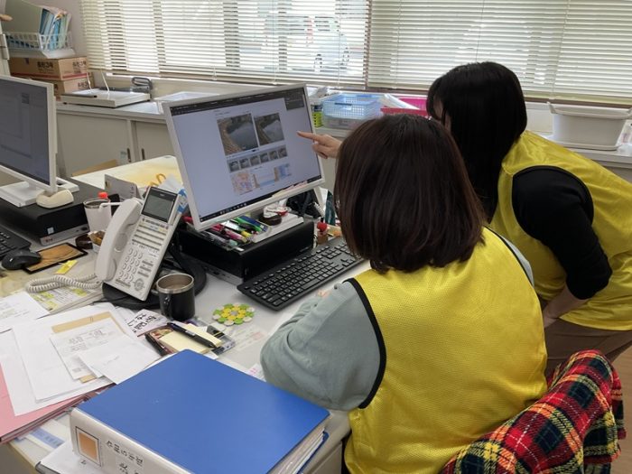 情報収集担当者が、三瓶川の水位をパソコンで確認しております。