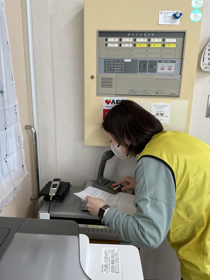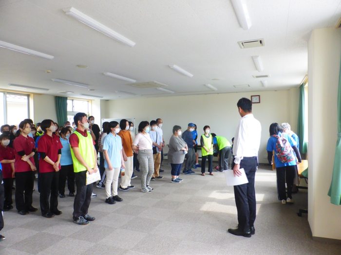 約60名の利用者と職員が防災センターに集合して、理事長から避難時に気を付けることなどの説明を受けました。